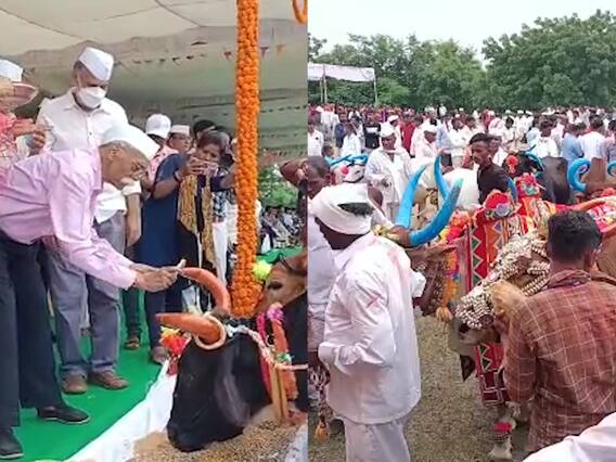 Bail Pola 2022 : आज शेतात राबणाऱ्या सर्जा-राजाचा म्हणजेच बैलपोळ्याचा (Bail Pola 2022) सण आहे. या निमित्ताने केवळ राज्यातच नव्हे तर जगभरात प्रसिद्ध असलेल्या जळगावात जैन उद्योग समूहातर्फे बैलांचे पूजन सालदार आणि शेतकऱ्यांचा सन्मान करत पोळा सण मोठ्या उत्साहात साजरा करण्यात आला. या कार्यक्रमाला उपस्थित भारताचे अनुशास्त्रज्ञ डॉक्टर अनिल काकोडकर तसेच ज्ञानपीठ पुरस्कार प्राप्त ज्येष्ठ साहित्यिक डॉ. भालचंद्र नेमाडे यांच्यासह जैन उद्योग समूहाचे अध्यक्ष अशोक जैन यावेळी उपस्थित होते.