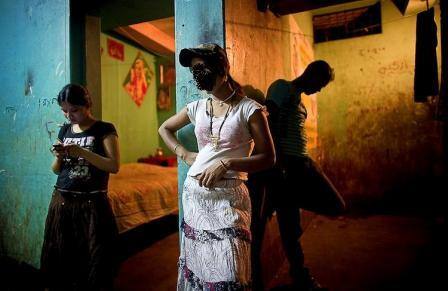Pachey (left) and (center) wait for customers outside their room on the 3rd floor of the Joinal Bari brothel in Faridpur, central Bangladesh. About 800 women and girls live and work inside the bustling brothel, comprised of four buildings situated on an important trading route on the banks of the Padma river. Many of chowkri (bonded sex workers) are underage. Some of the girls are runaways who leave home to escape a bad situation or marriage, and end up on the brothels when they have no where else to go. Many others have been kidnapped and sold to a madame by a parent or relative. They must take on 5-10 clients per day, and most receive no pay because they must repay their debt to their madame.