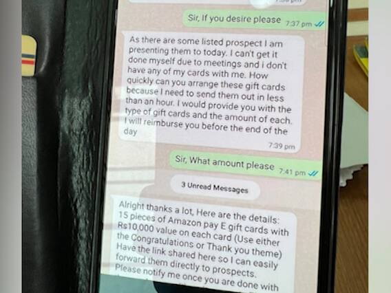 कशी फसवणूक करतात?शिंत्रे यांनी सांगितलं की, आपण मीटिंगमध्ये आहे आणि खूप व्यस्त असल्यामुळे ते अॅमेझॉन गिफ्ट कार्ड खरेदी करण्यासाठी जाऊ शकत नाही, असा मेसेज गुन्हेगार कनिष्ठांना करतात. हे ठक त्यांच्या मेसेजमध्ये लिहितात की आपल्याला हे गिफ्टकार्ड लवकरात लवकर हवं आहे आणि 5 ते 10 हजार रुपयांचे गिफ्ट कार्ड विकत घेण्यास सांगून ते तातडीने पाठवून देण्यासाठी सांगतात, जेणेकरुन कनिष्ठ दर्जाच्या कर्मचाऱ्याला ही गोष्ट कोणाकडून तरी तपासावी लागण्यासाठी वेळ मिळू नये आणि तोपर्यंत त्याची फसवणूक होईल.