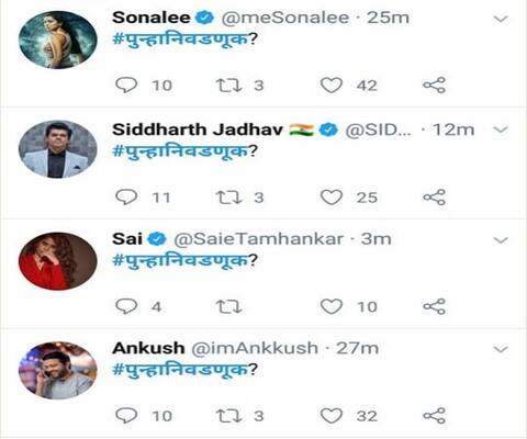मराठी चित्रपट कलाकारांच्या एकसारख्या ट्वीटवरुन वाद रंगला आहे. बऱ्याच मराठी कलाकारांनी #पुन्हानिवडणूक हा हॅशटॅग वापरत ट्वीट केले आहेत.
