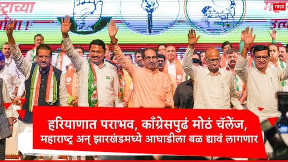 मुंबई : हरियाणा विधानसभा निवडणुकीत(Haryana Assembly Election Result 2024) भाजपनं सलग तिसऱ्यांदा विजय मिळवला. भाजपनं 90 पैकी 48 जागांवर विजय मिळवत सत्ता कायम ठेवली. काँग्रेसची कामगिरी 2019 च्या विधानसभा निवडणुकीतील निकालापेक्षा सुधारली असली तरी ते बहुमताजवळ पोहोचू शकले नाहीत. काँग्रेसला 37 जागांवर विजय मिळवण्यात यश मिळालं. हरियाणात अपक्षांनी 3 आणि भारतीय लोकदलानं 2 जागा जिंकल्या. हरियाणामधील पराभवानंतर काँग्रेससमोर मोठं आव्हान उभं राहिलं आहे. देशातील प्रमुख राज्य असलेल्या महाराष्ट्राची विधानसभा निवडणूक काही दिवसांवर आहे. त्यासोबत झारखंड राज्यातील निवडणूक देखील होणार आहे. या दोन्ही राज्यांमध्ये मित्र पक्षांना सन्मान देऊन जुळवून घेण्याची भूमिका काँग्रेसला घ्यावी लागेल.