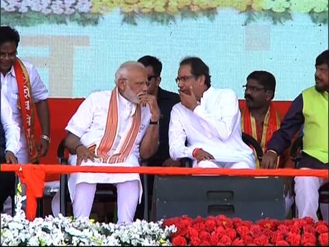 UNCUT | वल्लभभाईंप्रमाणेच तुम्हीही मराठवाड्याच्या पाठीशी राहा, उद्धव ठाकरे यांचं भाषण | लातूर | एबीपी माझा तर दुसरीकडे उद्धव ठाकरे यांनी देखील मोदींची स्तुती करायला कुठेही कमी पडू दिलं नाही. सुरुवातीलाच भाजपने जाहीर केलेल्या जाहीरनाम्याबद्दल मोदीजींचं आभार मानतो, अशा शब्दात त्यांनी कौतुक केलं. रझाकारांच्या वेळेस जसे वल्लभभाई मराठवाड्याच्या पाठीशी उभे राहिले तसेच मोदीजी तुम्ही उभे राहा, अशी मागणीही ठाकरे यांनी केली. सोबतच आम्ही आमचा उमेदवार मोदीजींच्या रूपात आम्ही आमचा उमेदवार घोषित केला आहे. आता विरोधकांनी आपला पंतप्रधान उमेदवार घोषित करावा, असे आव्हान त्यांनी विरोधकांना दिले. शिवसेना-भाजप सत्तेत आल्यानंतर दोन्ही पक्षांमध्ये मतभेद निर्माण झाले होते. त्यानंतर उद्धव ठाकरेंनी पंतप्रधान नरेंद्र मोदींच्या कारभारावर अनेकदा टीकास्त्र सोडलं होतं. राम मंदिर, नोटबंदी, शेतकरी आत्महत्या, राफेल, शेतकरी कर्जमाफी इत्यादी मुद्द्यांवरुन उद्धव ठाकरेंनी नरेंद्र मोदी आणि भाजपला कोडींत पकडण्याचे प्रयत्न केले होते. अनेकदा उद्धव ठाकरे यांनी पंतप्रधान नरेंद्र मोदींवर थेट टीका केली होती. काही वेळा भाजपकडूनही मोदींवरील टीकेनंतर उद्धव ठाकरेंना प्रत्युत्तर देण्याचे प्रयत्न झाले होते.