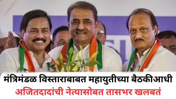 मुंबई: राज्याच्या मुख्यमंत्र्यांचा आणि दोन्ही उपमुख्यमंत्र्याचा शपथविधी काल (गुरूवारी) मुंबईतील आझाद मैदानावर पार पडला. त्यानंतर आता राज्यातील मंत्रीमंडळ विस्ताराच्या घडामोडींना वेग आला आहे. मंत्रिमंडळ विस्ताराबाबत उद्या (शनिवारी) राज्यातील महायुतीच्या नेत्यांची बैठक होणार असल्याची माहिती आहे. महायुतीच्या नेत्यांच्या बैठकीपूर्वी राष्ट्रवादी काँग्रेस पक्षाच्या तिन्ही वरिष्ठ नेत्यांची आज बैठक पार पडली. प्रफुल पटेल (Praful Patel) यांच्या सीजे हाऊस येथील निवासस्थानी पक्षाचे अध्यक्ष अजित पवार (Ajit Pawar), प्रदेशाध्यक्ष सुनील तटकरे (Sunil Tatkare) आणि राष्ट्रीय कार्याध्यक्ष प्रफुल पटेल (Praful Patel) यांच्यात एक तास बैठक पार पडली. या बैठकीमध्ये मंत्रिमंडळ विस्ताराबाबत चर्चा झाल्याची माहिती आहे. तर या बैठकीत 7 कॅबिनेट आणि 3 राज्यमंत्री पदाचे चेहरे निश्चित झाल्याची माहिती सूत्रांनी दिली आहे.