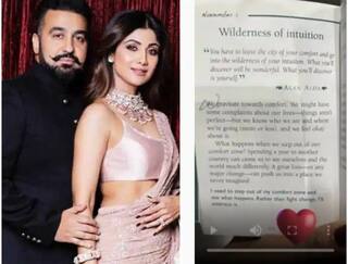शिल्पाने सोशल मीडियावर 'वाइल्डरनेस ऑफ इंट्यूशन' या पुस्तकाच्या पानाचा फोटो शेअर केला आहे. यामध्ये एलन एल्डा(Alan Alda) यांनी लिहीलेले वाक्य दिसत आहे. वाक्याचा अर्थ असा होतो की, 'तुम्ही आराम करण्याऐवजी इंट्यूशनमध्ये गेलं पाहिजे. तिथे तुम्हाला जे मिळेल ते अद्भुत असेल. तिथे तुम्हाला स्वत:बद्दल नवी गोष्ट कळेल.' या पुस्तकामध्ये कंम्फर्ट झोनच्या बाहेर जाण्याबद्दल सांगितले आहे. राज कुंद्राच्या अटकेनंतर शिल्पाने सोशल मीडियावर त्याच्यासोबत कोणताही फोटो शेअर केला नाही. त्याआधी शिल्पा कुंटुंबासोबतचे फोटो सोशल मीडियावर नेहमी शेअर करत होती.