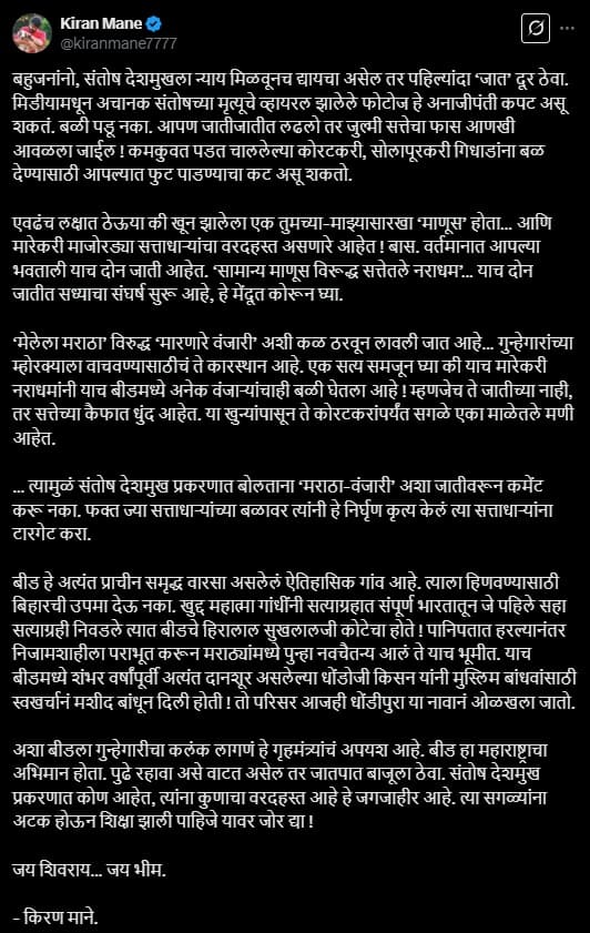किरण मानेंनी ट्वीट केलं आहे. या ट्वीटमध्ये त्यांनी म्हटलं आहे की, "बहुजनांनो, संतोष देशमुखला न्याय मिळवूनच द्यायचा असेल तर पहिल्यांदा 'जात' दूर ठेवा. मिडीयामधून अचानक संतोषच्या मृत्यूचे व्हायरल झालेले फोटोज हे अनाजीपंती कपट असू शकतं. बळी पडू नका. आपण जातीजातीत लढलो तर जुल्मी सत्तेचा फास आणखी आवळला जाईल ! कमकुवत पडत चाललेल्या कोरटकरी, सोलापूरकरी गिधाडांना बळ देण्यासाठी आपल्यात फुट पाडण्याचा कट असू शकतो."