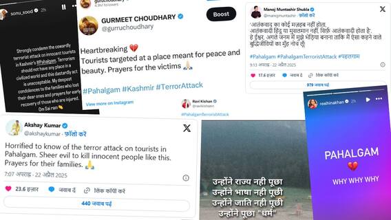 Celebs On Pahalgam Terrorist Attack: जम्मू आणि काश्मीरमधील पहलगाममध्ये झालेल्या दहशतवादी हल्ल्यानं देश हादरला. सूत्रांनी दिलेल्या माहितीनुसार, या हल्ल्यात 16 जणांचा मृत्यू झाल्याची पुष्टी करण्यात आली आहे आणि त्याव्यतिरिक्त अनेक लोक जखमी झाले आहेत. पहलगाममधील या वेदनादायक हल्ल्यानं बॉलिवूडपासून ते टीव्ही इंडस्ट्रीपर्यंतच्या स्टार्सना धक्का बसला आहे. अशा परिस्थितीत, सेलिब्रिटींनी सोशल मीडियाद्वारे यावर प्रतिक्रिया दिल्या आहेत. पाहुयात कोणी काय प्रतिक्रिया दिली ते सविस्तर...