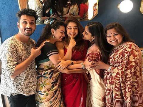 नेहा पेंडसेभोवती कोंडाळं करुन पाच जण उभे असल्याचं फोटोमध्ये दिसत आहे. नेहाने हाताची घडी तोंडावर बोट ठेवलं आहे. एका बाजूने श्रुती मराठेने, तर दुसरीकडून हेमांगी कवीने मिठी मारली आहे.