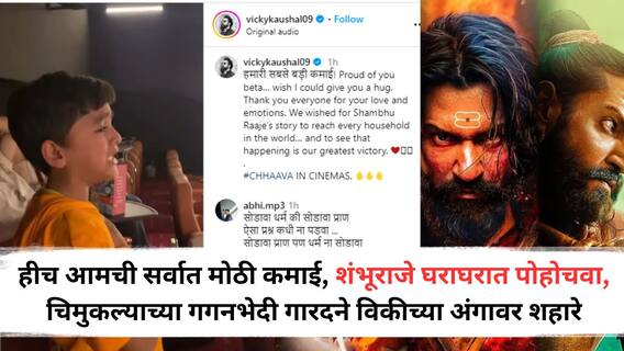 Chhaava: राज्यासह देशभरात सध्या 'छावा' (Chhaava) चित्रपटाची मोठी क्रेझ दिसून येत आहे. विकी कौशल, रश्मिका, अक्षय खन्ना, यांच्यासह इतर कलाकारांच्या कामांचं मोठं कौतुक सध्या होतंय (Vicky Kaushal). छत्रपती संभाजी महाराजांच्या लूकमध्ये विकी कौशल शोभून दिसतोय. या चित्रपटातील डॉयलॉग एकताना आणि चित्रपट पाहताना अंगावरती काटा उभा राहतो. प्रेक्षकांनी सर्वांच्या कामांचं, आणि दिग्दर्शकाचं कौतुक केलं आहे, चित्रपट पाहून प्रेक्षक भारावले आहेत. अगदी लहान मुलांपासून ते वयोवृध्दांपर्यंत सर्वांच्या पसंतीला हा चित्रपट उतरतो आहे. हा चित्रपट पाहिल्यानंतर अगदी लहान मुलांच्या डोळ्यातही पाणी आल्याचं दिसून येतंय. एका चिमुकल्याचा व्हिडिओ सध्या सोशल मीडियावर व्हायरल होत आहे, ज्यामध्ये सिनेमा संपल्यावर तो चिमुकला गर्जना करताना दिसतोय. विकीने या चिमुकल्याचा व्हिडिओ शेअर करत पोस्ट लिहिली आहे.