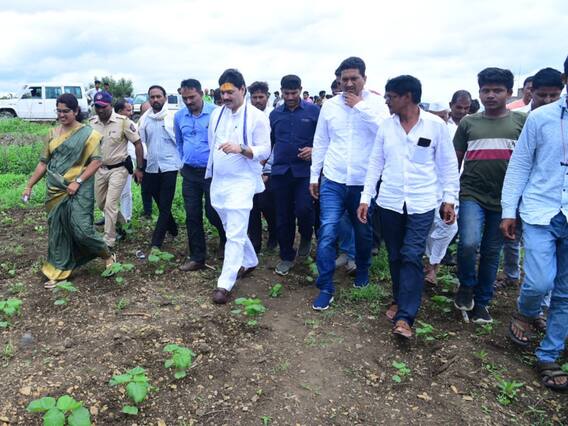Dhananjay Munde in Farmers Farm : मागील वर्षीप्रमाणे यंदाही परळी वैजनाथ तालुक्यासह बीड जिल्ह्यातील केज, अंबाजोगाई या भागात तसेच मराठवाड्यातील आणखी काही जिल्ह्यांमध्ये मुख्यत्वे सोयाबीन आणि कापसाच्या पिकाला गोगलगायी नष्ट करत असल्याच्या तक्रारी प्राप्त झाल्या आहेत. त्यामुळे कृषीमंत्री धनंजय मुंडे (Dhananjay Munde) यांनी आज स्वतः शेतकऱ्यांच्या (Farmers) बांधावर जाऊन नुकसानीची पाहणी केली. यावेळी त्यांनी नुकसानीचे तत्काळ पंचनामे करण्याचे आदेश दिले आहे.