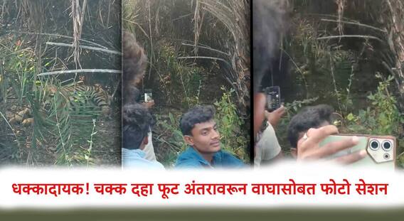 Bhandara : एखाद्या घटनेत एखाद्या अधिकाऱ्यांला घेराव घातल्याचं आजपर्यंत आपल्याला बऱ्याचदा बघायला मिळाले आहे. मात्र, भंडाऱ्यात चक्क ग्रामस्थांनीचं जंगलाचा राजा असेलेल्या वाघोबाला घेराव घताला आहे. इतकंच नव्हे तर जमावातील काहींनी तर अगदी दहा फूट अंतरावरून वाघाचे व्हिडिओ, फोटो आणि त्याच्यासोबत सेल्फी काढल्याचा धक्कादायक प्रकार समोर आला आहे. वाघासोबत फोटो, व्हिडिओ आणि सेल्फी काढतानाचा व्हिडिओ सध्या समाज माध्यमावर प्रचंड व्हायरल होत असल्याचा हा धक्कादायक प्रकार समोर आला आहे.