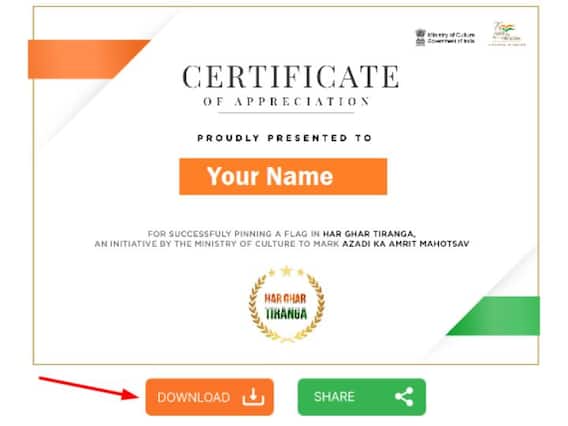 लोकांना मिळणार 'हर घर तिरंगा' प्रमाणपत्र13 ते 15 ऑगस्ट दरम्यान, जे प्रत्येक घरातील तिरंगा पोर्टलला भेट देतील आणि त्यांच्या ठिकाणी ध्वज पिन करतील, त्यांना प्रमाणपत्र दिले जाईल. याविषयी अधिक माहिती मिळवण्यासाठी तुम्ही harghartiranga.com या अधिकृत वेबसाइटला भेट देऊ शकता. याशिवाय, जर तुम्ही तुमचे प्रमाणपत्र अद्याप डाउनलोड केले नसेल, तर आम्ही तुम्हाला काही स्टेप्स सांगत आहोत, ज्याचे पालन करून तुम्ही तुमचे प्रमाणपत्र डाउनलोड करू शकता.