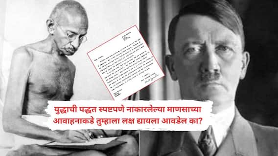 Mahatma Gandhi Letter To Adolf Hitler : राष्ट्रपित महात्मा गांधींनी 1939 मध्ये जर्मनीचा नाझी हुकूमशहा ॲडॉल्फ हिटलरला पत्र लिहिले होते. मात्र, हिटलरला हे पत्र मिळाले नाही. 23 जुलै 1939 रोजी लिहिलेल्या या पत्रात महात्मा गांधींनी हिटलरला युद्ध पुढे ढकलण्याचे आवाहन केले होते. मात्र, हे पत्र लिहिल्यापासून महिनाभरातच जर्मनीने पोलंडवर हल्ला केला होता. गांधी यांनी हिटरलला लिहिलेलं पत्र पोहोचलं नव्हतं.
