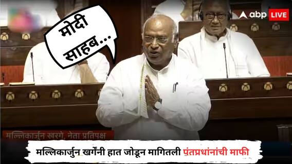 Mallikarjun Kharge in Rajya Sabha: नवी दिल्ली: संसदेच्या पावसाळी अधिवेशनात (Parliament Monsoon Session) आज विरोधक चांगलेच आक्रमक झाल्याचं पाहायला मिळालं. राज्यसभेतील विरोधी पक्षनेते आणि काँग्रेसचे (Congress) अध्यक्ष मल्लिकार्जुन खर्गे (Mallikarjun Kharge) यांनी सत्ताधाऱ्यांना चांगलंच फैलावर घेतलं. सोमवारी (1 जुलै) त्यांनी भाजपच्या नेतृत्वाखालील एनडीए सरकारवर जोरदार हल्ला चढवला. मात्र, त्यानंतर राज्यसभेत उभं राहून मल्लिकार्जुन खर्गेंनी हात जोडून पंतप्रधान नरेंद्र मोदींची माफी मागितली. राज्यसभेतील विरोधी पक्षनेते आणि काँग्रेसचे अध्यक्ष मल्लिकार्जुन खर्गे सोमवारी (1 जुलै) चांगलेच आक्रमक झाल्याचं पाहायला मिळालं. त्यांनी भाजपच्या नेतृत्वाखालील एनडीए सरकारवर जोरदार हल्ला चढवला. एवढंच नाही तर पंतप्रधान नरेंद्र मोदी यांच्या वक्तव्याचा संदर्भ देत, त्यांनी राज्यसभेत हात जोडून माफी मागितली. मल्लिकार्जुन खर्गे यांनी माफी का मागितली? असा प्रश्न सर्वांच्याच मनात आला आहे. काय आहे संपूर्ण प्रकरण? जाणून घेऊयात सविस्तर...