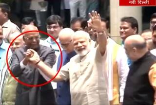 अर्ज भरल्यानंतर भाजपच्या नेत्यांची फौज बाहेर आली. यावेळी पंतप्रधान नरेंद्र मोदी, त्यांच्या शेजारी लालकृष्ण अडवाणी आणि त्यानंतर रामनाथ कोविंद अशा क्रमानं चालत होते. मोदींनी शेजारीच असलेल्या अडवाणींना वगळून थेट पलिकडे असलेल्या कोविंद यांचा हात हातात घेतला आणि उपस्थितांना अभिवादन केलं.