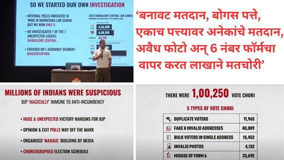 Rahul Gandhi: लोकसभेतील विरोधी पक्षनेते राहुल गांधी यांनी आज (7 ऑगस्ट) मतदार यादी पडताळणीतील अनियमिततेबाबत सादरीकरण करत निवडणूक आयोग आणि भाजपवर मतचोरीचा गंभीर आरोप केला. स्क्रीनवर कर्नाटकची मतदार यादी दाखवताना राहुल म्हणाले की, महाराष्ट्र आणि कर्नाटक या दोन्ही राज्यांच्या मतदार यादीत संशयास्पद मतदार आहेत. ते म्हणाले की, महाराष्ट्राचे निकाल पाहिल्यानंतर आमच्या शंकांना पुष्टी मिळाली की निवडणूक चोरी झाली आहे. मशीन रीडेबल मतदार यादी न दिल्याने, निवडणूक आयोगाने भाजपशी संगनमत करून महाराष्ट्राची निवडणूक चोरली आहे अशी आमची खात्री पटली असल्याचे ते म्हणाले. राहुल म्हणाले की, कर्नाटकात वेगवेगळ्या बूथच्या मतदार यादीत एकाच व्यक्तीचे नाव आहे. अनेक ठिकाणी यादीत लोकांचे फोटो नाहीत. त्याच वेळी, अनेक ठिकाणी बनावट पत्ते लिहिले गेले आहेत.