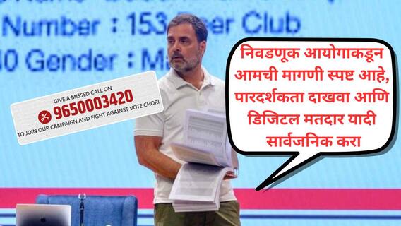 राहुल गांधी यांनी ट्विट करत म्हटले आहे की, मतांची चोरी 'एक व्यक्ती, एक मत' या मूलभूत लोकशाही तत्त्वावर हल्ला आहे. मुक्त आणि निष्पक्ष निवडणुकांसाठी स्वच्छ मतदार यादी आवश्यक आहे. निवडणूक आयोगाकडून आमची मागणी स्पष्ट आहे, पारदर्शकता दाखवा आणि डिजिटल मतदार यादी सार्वजनिक करा, जेणेकरून जनता आणि राजकीय पक्ष स्वतः तिचे ऑडिट करू शकतील. तुम्हीही आमच्यात सामील व्हा आणि या मागणीला पाठिंबा द्या. http://votechori.in/ecdemand ला भेट द्या किंवा 9650003420 वर मिस्ड कॉल द्या. ही लोकशाहीच्या रक्षणासाठीची लढाई आहे.