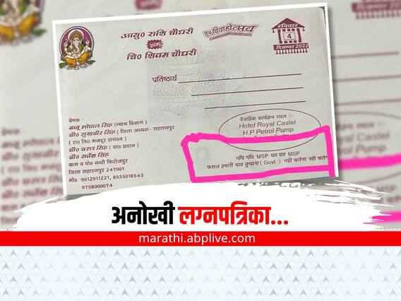 MSP : गेल्या अनेक दिवसांपासून विविध शेतकरी संघटना (Shetkari Sanghatana) हमीभावाच्या मुद्द्यावरुन आक्रमक झाल्या आहेत. देशात MSP चा कायदा करावा, अशी मागणी शेतकरी संघटनांनी केली आहे. अशातच MSP च्या कायद्यासाठी एका शेतकऱ्यानं अनोखी शक्कल लढवली आहे. उत्तर प्रदेशमधील (UP) सरहानपूर जिल्ह्यातील एका शेतकऱ्यानं आपल्या मुलाच्या लग्नपत्रिकेमध्ये ( wedding card ) केंद्र सरकारचे लक्ष वेधण्यासाठी MSP च्या कायद्यासंदर्भात उल्लेख केला आहे. प्रत्येक शेतकऱ्यांना आपल्या हक्काच्या हमीभावाच्या कायद्याची जाणीव करण्याकरता वेगळ्या पध्दतीनं लग्नपत्रिका काढली आहे.
