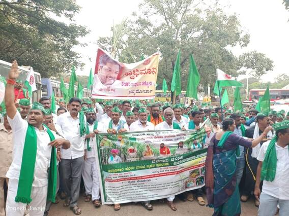 बेळगाव : स्वाभिमानी शेतकरी संघटनेचे अध्यक्ष राजू शेट्टी (Raju Shetti March in Belgaum) यांच्या नेतृत्वात बेळगाव जिल्हाधिकारी कार्यालयावर विराट मोर्चा काढण्यात आला. राष्ट्रीय व आंतरराष्ट्रीय पातळीवर साखरेला चांगला दर असल्याने कर्नाटकमधील ऊस उत्पादक (Sugarcane) शेतकऱ्यांना प्रतिटन 400 रूपये दुसरा हप्ता, वजनकाटे ऑनलाईन व महाराष्ट्र सरकारप्रमाणे वाहतूदारांची फसवणूक केलेल्या मुकादमांवर कारवाई करण्याच्या मागणीसाठी राजू शेट्टींच्या नेतृत्वात बेळगाव जिल्हाधिकारी कार्यालयावर हजारो ऊस उत्पादक शेतकऱ्यांसह धडक मोर्चा काढण्यात आला.