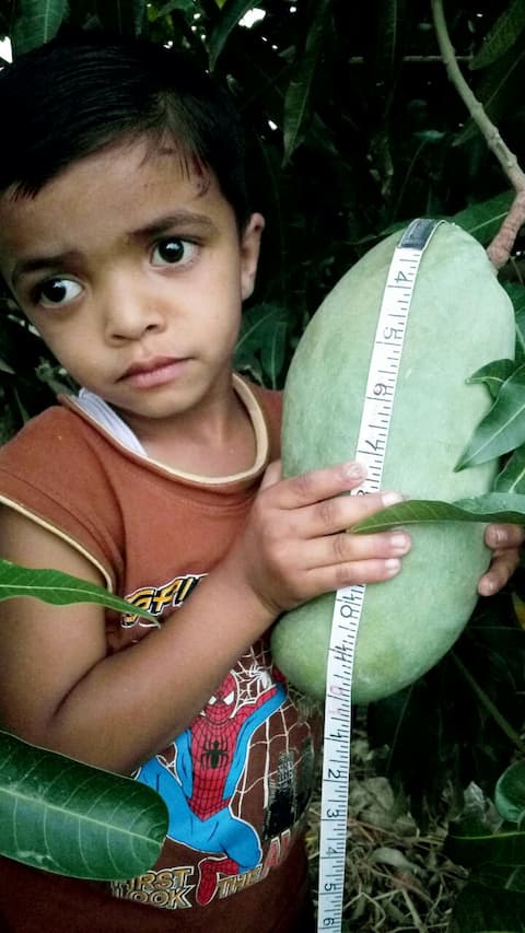 एका शेतकऱ्याच्या झाडाला एक फूट लांब आणि तीन ते चार किलो वजनाचे आंबे लागले आहेत. एवढे मोठे आंबे पाहण्यासाठी परिसरातील नागरिकांची झुंबड उडाली आहे.