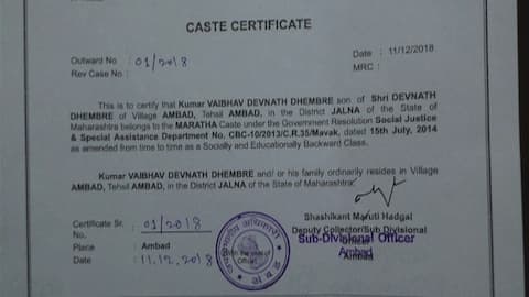 महाराष्ट्र सरकारनं मराठा समाजाला आरक्षण दिल्यानंतर पहिलं मराठा जात प्रमाणपत्र देण्यात आलं आहे. जालना जिल्ह्यातील अंबडमध्ये वैभव ढेंबरे या विद्यार्थ्याला पहिलं मराठा कास्ट सर्टिफिकेट देण्यात आलं आहे.