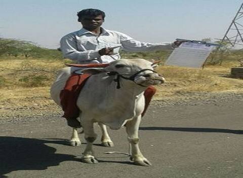 अहमदनगरमधील कर्जतच्या निमगाव डाकूतील विद्यार्थ्याने हा अनोखा मार्ग पत्करला आहे. बसने प्रवास करण्यासाठी पैसे नसल्यामुळे विजय काळे या विद्यार्थ्याने बैलावर बसून परीक्षा केंद्र गाठलं. विजयचा इतिहासाचा पेपर होता, मात्र बसच्या प्रवासासाठी 44 रुपये नसल्यानं त्यानं बैलावर बसून 19 किलोमीटरचं अंतर कापलं आणि तो कोरेगावच्या परीक्षाकेंद्रावर पोहोचला.