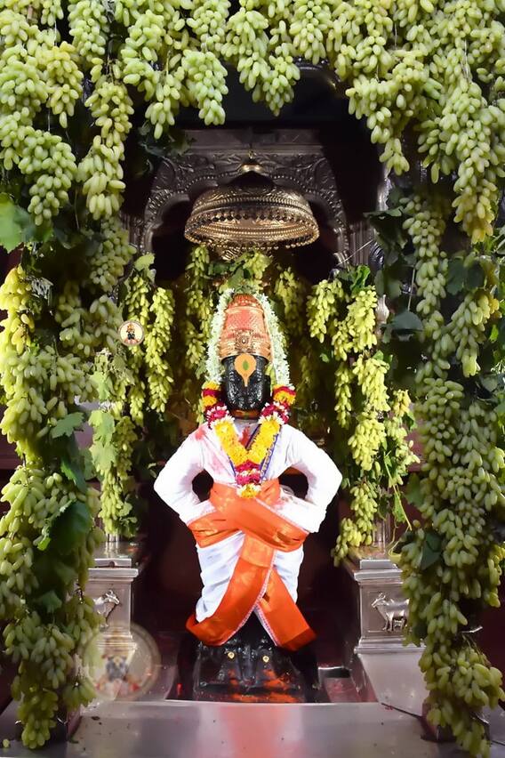 आज फाल्गुन शुद्ध अर्थात आमलकी एकादशीनिमित्त विठुरायाच्या मंदिराला द्राक्षे आणि फुलांची आकर्षक सजावट करण्यात आली आहे . रांजणगाव येथील विठ्ठल भक्त नानासाहेब पाटील यांनी ही सेवा दिली आहे . या सजावटीसाठी झेंडू , शेवंती , आर्केड ऍथोरियम , केळीचे खुंट या सोबत १०० किलो द्राक्षांचा वापर विठ्ठल रुक्मिणी गाभारा सजविण्यासाठी करण्यात आला आहे. सध्या आपल्या बागेत पिकलेली द्राक्षे देवाच्या चरणी अर्पण करण्यासाठी अनेक भाविक येत असतात मात्र नानासाहेब पाटील यांनी थेट द्राक्ष व फुलांच्या मदतीने आकर्षक सजावट केली आहे.
