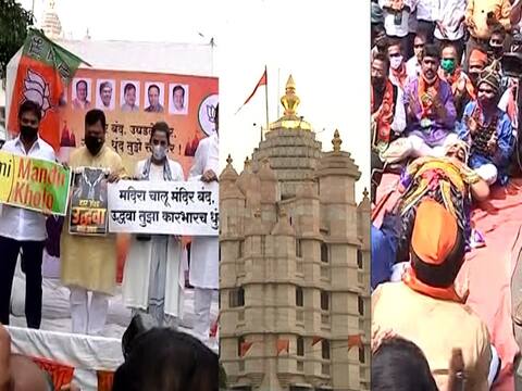 मुंबईतील सिद्धिविनायक मंदिराबाहेर घंटनाद भाजपने आज सकाळी 11 वाजता मुंबईतील सिद्धिविनायक मंदिराच्या दारात घंटानाद आंदोलनाला सुरुवात केली. या आंदोलनात विधानपरिषदेचे विरोधी पक्षनेते प्रवीण दरेकर यांच्यासह पक्षाचे आमदार, खासदार आणि नगरसेवक सहभागी झाले.