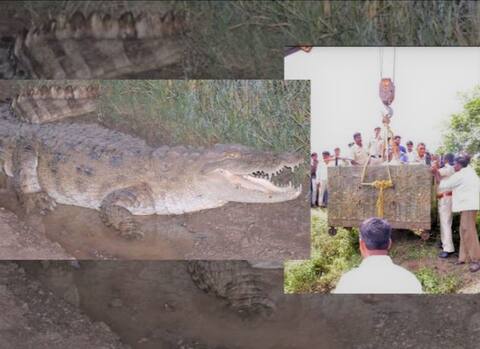 बाभूळगाव परिसरात वन विभागाच्या अधिकाऱ्यांनी मोठ्या शर्थीनं मगर बाहेर काढली.