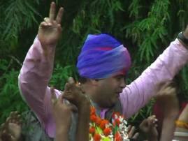 धुळे : रोजगार हमी योजना, पर्यटनमंत्री जयकुमार रावल हे मंत्री झाल्यानंतर प्रथमच आपल्या गावी दोंडाईचात आल्याने त्यांचे जंगी स्वागत करण्यात आले. यानिमित्त जयकुमार रावल यांची दोंडाईचा शहरातील प्रमुख मार्गावरून स्वागत मिरवणूक काढण्यात आली. रावल यांचे कट्टर विरोधक असलेले राष्ट्रवादीचे माजी कामगार मंत्री हेमंत देशमुख यांच्या निवासस्थानासमोर ही स्वागत मिरवणूक आली असताना, मिरवणुकीत सुरु असलेल्या वाद्यावर मंत्री जयकुमार रावल स्वत: थिरकले. रावल एवढ्यावरच थांबले नाहीत, त्यांनी हेमंत देशमुख यांच्या निवासस्थानाकडे पहात विजयाचा सिम्बॉल V दाखवत, थम म्हणजे अंगठा देखील दाखवला. मंत्री जयकुमार रावल थिरकल्यानंतर कार्यकर्त्यांच्या उत्साहाला अधिकच उधाण आलं. कार्यकर्त्यांचा हा उत्साह पाहून हेमंत देशमुख यांच्या निवासस्थानाबाहेर पोलीस बंदोबस्त तैनात करण्यात आला होता.
