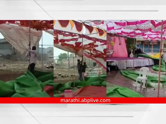 Unseasonal Rain: अवकाळी पावसाने छत्रपती संभाजीनगर जिल्ह्यात (Chhatrapati Sambhaji Nagar District) शुक्रवारी अक्षरशः धुमाकूळ घातला. विशेष म्हणजे शुक्रवारी लग्नाची (Marriage) तिथी असल्याने अनेक ठिकाणी लग्नसमारंभ आयोजित करण्यात आले होते. त्यामुळे अवकाळी पावसासह झालेल्या वादळी वाऱ्याचं फटका लग्नसमारंभात देखील बसला आहे. अचानक सुरु झालेल्या वादळी वाऱ्यामुळे आणि पावसाने मंडपाचे होत्याचे नव्हते करून टाकले. तर जोरदार वाऱ्यामुळे मंडप उडून जात असल्याने त्याचा बचाव करण्यासाठी उपस्थितांची चांगलीच धावपळ उडाली. तर संभाजीनगरच्या गांधेली आणि बालानगर गावातील अशाच लग्नात उडलेल्या धावपळीचे व्हिडिओ सोशल मीडियावर व्हायरल होत आहे.