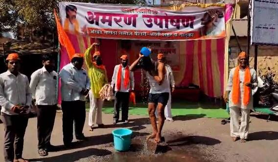 Maratha Reservation Agitation : मराठा आंदोलक मनोज जरांगे पाटील यांच्या समर्थनार्थ बार्शीत आमरण उपोषण सुरु करण्यात आलं आहे. बार्शी येथील आंदोलक आनंद काशीद यांनी गेल्या 3 दिवसापासून मराठा समाजाला आरक्षण मिळावं यासाठी आमरण उपोषण सुरु केलं आहे. बार्शी तहसील कार्यालयासमोर हे अनोखे आंदोलन करत सरकारचे लक्ष वेधण्याचा प्रयत्न करण्यात आला. उपोषणस्थळी आनंद काशीद आणि त्यांच्या समर्थकांनी सरकारच्या निषेधार्थ वैकुंठ स्नान करत केले आंदोलन.