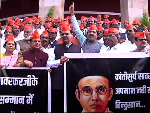 नागपूर : नागपूर हिवाळी अधिवेशनच्या पहिल्याच दिवशी भाजप आमदार स्वातंत्र्यवीर सावरकरांच्या मुद्द्यावरुन आक्रमक झाले आहेत. राहुल गांधींनी सावरकरांबाबतच्या वक्तव्याबद्दल माफी मागावी, अशी मागणी भाजपने लावून धरली आली. 'सावरकरांचा अपमान करणाऱ्या राहुल गांधींचा धिक्कार असो', 'स्वातंत्र्यवीर सावरकर का अपमान, नही सहेगा हिंदुस्थान' अशा घोषणा भाजप आमदारांनी दिल्या. भाजपच्या सर्व आमदारांनी 'मी सावरकर' नावाच्या भगव्या टोप्या घातल्या होत्या.
