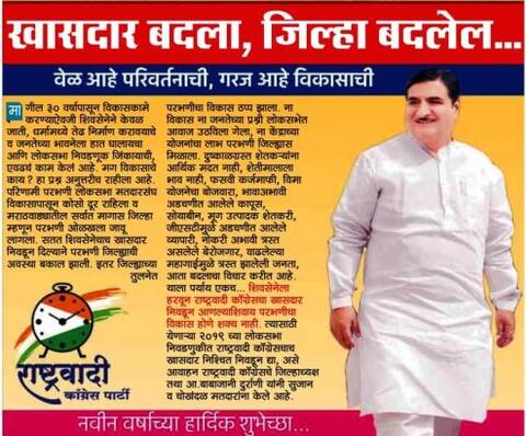 परभणी : परभणी जिल्ह्यात मागील 30 वर्षांपासून शिवसेनेचा खासदार निवडून येत आहे. लोकसभा निवडणुकीत राष्ट्रवादी काँग्रेसला अद्याप यश आलेलं नाही. त्यातच यंदा ही जागा कुठल्याही परिस्थतीत जिंकायची असा आदेश पक्षाकडून आहेत. त्यामुळे पक्षाचे जिल्हाध्यक्ष आमदार बाबाजानी दुर्राणी अनोखी शक्कल लढवली आहे. बाबाजानी दुर्राणी यांनी वृत्तपत्रात नववर्षाच्या जाहिरात जनतेला खासदार बदलण्याचे आवाहन केलं आहे. 'खासदार बदला, जिल्हा बदलेल... वेळ आहे परिवर्तनाची, गरज आहे विकासाची' या मथळ्याखाली ही जाहिरात प्रकाशित करण्यात आली आहे. शिवसेनेने आजपर्यंत केवळ जातीय तेढच निर्माण केल्याचा आरोप त्यांनी या जाहिरातीमधून केला आहे. सतत शिवसेनेचा खासदार निवडून दिल्याने जिल्ह्याची अवस्था बकाल झाली आहे. इतर जिल्ह्यांच्या तुलनेत परभणीचा विकास ठप्प झाला आहे. त्यामुळे शिवसेनेला हरवून राष्ट्रवादी काँग्रेसचा खासदार निवडून आणल्याशिवाय परभणीचा विकास शक्य नाही, असं जाहिरातीत म्हटलं आहे. यावर शिवसेना काय प्रतिक्रिया देणार, हे पाहणं औत्सुक्याचं ठरणार आहे. पण ही जाहिरात परभणीकरांमध्ये चर्चेचा विषय बनली आहे.