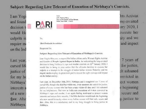 'निर्भया प्रकरणातील दोषींना 22 जानेवारी 2020 ला फाशी देण्याच्या निर्णयाचा मी आदर करते. मी तुम्हाला विनंती करते की, निर्भयाच्या चारही दोषींना फाशीची शिक्षा देण्याच्या संपूर्ण प्रक्रियेचं लाइव्ह टेलिकास्ट करण्यात यावं. यासाठी तुम्ही सर्व नॅशनल आणि इंटरनॅशनल मीडियाला परवानगी द्यावी. हा निर्णय महिलांच्या सुरक्षेच्या बाबतीत मोठा बदल ठरू शकतो.', अशी मागणी NGO च्या संस्थापक आणि सोशल अॅक्टिव्हीस्ट योगिता भयाना यांनी केली आहे. तसेच परि संस्थेच्या मागणीला भूमाता ब्रिगेडच्या तृप्ती देसाईंनी पाठिंबा दिला आहे.