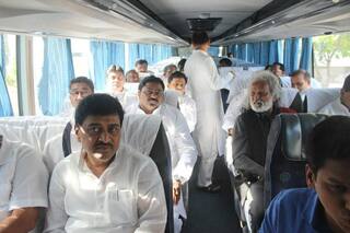 चंद्रपूर : संघर्षयात्रेत बडेजाव टाळा असे आदेश विरोधी पक्षांनी दिले असले तरी त्याचा प्रत्यय संघर्षयात्रा सुरु होण्यापूर्वीच आला. एसी बसमधून विरोधी पक्षांचे आमदार चंद्रपुरात दाखल झाले.