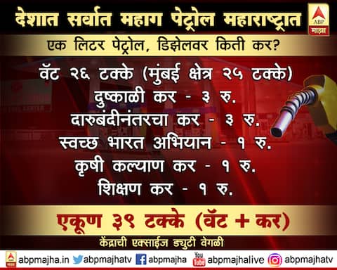 मुंबई : पेट्रोल आणि डिझेलच्या दरवाढीपासून कोणताही दिलासा मिळण्याची चिन्हं दिसत नाहीत. कारण, पेट्रोल आज पुन्हा एकदा 11 पैशांनी वाढलं आहे. राज्यातील 36 जिल्ह्यांपैकी 23 जिल्ह्यांमध्ये पेट्रोलने नव्वदी पार केली आहे. तर आठ जिल्हे असे आहेत, जिथे पेट्रोल जवळपास नव्वद रुपये प्रति लिटर आहे. डिझेलच्या दरात आज कोणतीही वाढ झालेली नाही. पण पेट्रोलने मात्र दरवाढीचे सर्व विक्रम मोडित काढण्याची आपली मालिका कायम ठेवलेली आहे. आयओसीएलच्या वेबसाईटनुसार, परभणी, नांदेड या जिल्ह्यांमध्ये पेट्रोल सर्वाधिक महाग आहे. नांदेड जिल्ह्यातील धर्माबादमध्ये पेट्रोल 92.55 रुपये प्रति लिटर आहे. तर धर्माबादपासून अवघ्या पाच किमीवर असलेल्या तेलंगणाच्या सीमेपलिकडे पेट्रोल चार रुपयांनी स्वस्त आहे. त्यामुळे पेट्रोलसाठी आता सीमा ओलांडण्याची वेळ ग्राहकांवर आली आहे. महाराष्ट्रात सर्वाधिक महाग पेट्रोल देशातलं सर्वाधिक महाग पेट्रोल महाराष्ट्रात मिळतं. राज्यात पेट्रोल आणि डिझेलवर 39 टक्के (+कर) वॅट वसूल केला जातो. यामध्ये विविध प्रकारच्या करांचा समावेश आहे. दुष्काळी कर तीन रुपये, महामार्गावरील दारूबंदीनंतर घटलेले उत्पादन तीन रुपये, शिक्षण कर एक रुपया, स्वच्छ भारत अभियानचा एक रुपया, कृषी कल्याण अभियान एक रुपया असा एकूण नऊ रुपये कर आकारला जातोय. सुप्रीम कोर्टाने महामार्गांलगतच्या दारु विक्रीवर बंदी आणली होती. त्यानंतर राज्य सरकारने महसुलात घट झाल्याचं कारण देत पेट्रोल आणि डिझेलवर तब्बल तीन रुपये कर आकारणी सुरु केली. काही काळाने दारु विक्रीही सुरु झाली, पण कर कायम आहे. तर 2014-15 सालच्या दुष्काळात आकारलेला तीन रुपये करही अजून कमी केलेला नाही. जिल्हा पेट्रोल दर डिझेल दर (प्रति लिटर) अहमदनगर 89.67 77.11 अकोला 89.81 77.26 अमरावती 91.05 79.71 औरंगाबाद 90.85 79.48 बीड 90.80 77.95 भंडारा 90.58 78.00 बुलडाणा 90.23 77.67 चंद्रपूर 89.77 77.24 धुळे 89.73 77.17 गडचिरोली 90.52 77.96 गोंदिया 90.86 78.27 हिंगोली 90.57 78.00 जळगाव 90.75 78.14 जालना 90.62 78.01 कोल्हापूर 89.96 77.40 लातूर 90.50 77.92 नागपूर 90.28 78.95 नांदेड 91.37 78.76 नंदुरबार 90.64 78.05 नाशिक 90.16 77.57 उस्मानाबाद 90.19 77.62 परभणी 91.58 78.94 पुणे 89.87 77.29 रायगड 89.82 77.22 रत्नागिरी 90.81 78.22 सांगली 89.70 77.15 सातारा 90.28 77.68 सिंधुदुर्ग 90.69 78.11 सोलापूर 90.85 79.04 ठाणे 89.88 78.51 वर्धा 89.99 77.43 वाशिम 90.28 77.72 यवतमाळ 90.82 78.23 पालघर 89.66 77.06 मुंबई उपनगर 89.87 78.49 मुंबई शहर 89.80 78.42