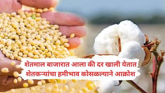 Crops Price Lower Than the MSP : राज्यात कापूस, सोयाबीन, हरभरा व तूर या पिकांना हमीभावापेक्ष कमी दर असल्याने शेतकऱ्यांचे कंबरडे मोडलं आहे. अगदी शेवटची अपेक्षा असलेल्या तुरीचे दर तर मागील तीन महिन्यात 4 हजाराने खाली कोसळल्याने शेतकरी चिंतेत आहे. काही महिन्याआधी 11 हजार प्रतिक्विंटल असलेली तूर सध्या 6 हजार 200 ते 7000 हजाराच्या दरात व्यपाऱ्यांकडून खरेदी केली जात आहे. त्यामुळे आमचा शेतमाल बाजारात आला की दर खाली येतात हा प्रश्न शेतकऱ्यांनी उपस्थित केला आहे.