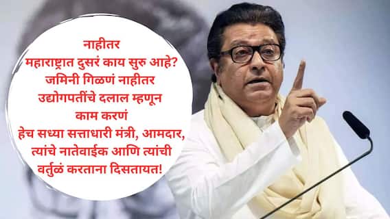Raj Thackeray: नाशिकमध्ये साधूग्राम उभारण्याच्या नावाखाली 1800 झाडांची होणारी कत्तल हा विकासाच्या आड लपलेला विनाशाचा अजून एक नमुना असल्याची तीव्र टीका महाराष्ट्र नवनिर्माण सेनेचे अध्यक्ष राज ठाकरे यांनी केली आहे. काही वर्षांपूर्वी भाजप सरकारने कोट्यवधी झाडं लावल्याचा दावा केला होता, ती झाडं कुठे दिसली नाहीत, असे सांगत तत्कालिन वनमंत्री सुधीर मुनगंटीवार यांचा उल्लेख न करता टोला लगावला आहे. मुनगंटीवार 33 कोटी वृक्ष लागवड राबवली होती. मात्र, या योजनेत मोठा भ्रष्टाचार झाल्याचा आरोप झाला होता. मात्र त्यांनाही 'क्लीन चिट' मिळाली. आता मंत्री गिरीश महाजन यांनी एका झाडाच्या बदल्यात पाचपट झाडे लावण्याची भाषा केली जात आहे. यावरून राज ठाकरे यांनी मुनगंटीवार यांचा उल्लेख न करता गिरीश महाजन यांना अप्रत्यक्ष टोला लगावला आहे. महाराष्ट्रातील सत्ताधारी मंत्री, आमदार, त्यांचे नातेवाईक आणि त्यांचे वर्तुळ हे सध्या उद्योगपतींचे दलाल म्हणून फिरताना दिसत असल्याचे राज ठाकरे यांनी म्हटले.