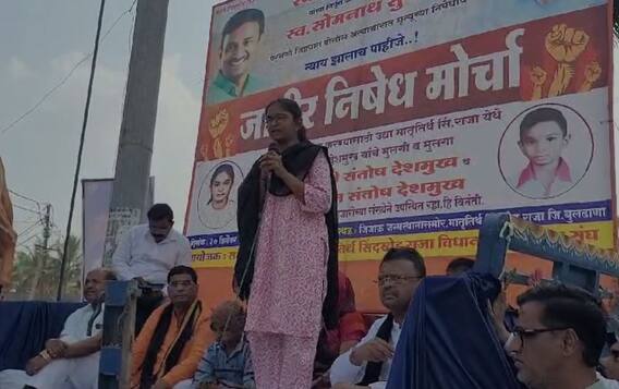 बीड जिल्ह्यातील मस्साजोगचे सरपंच संतोष देशमुख यांची हत्या करणाऱ्या आरोपींना तात्काळ पकडा. हा खटला फास्टट्रॅक कोर्टात चालवा, अशा मागण्या घेऊन आज बुलढाण्यातील सिंदखेड राजा इथं मराठा समाज बांधवांकडून राजमाता जिजाऊ यांचे जन्मस्थान राजवाडा ते तहसील कार्यालय असा मोठा मोर्चा काढण्यात आला. राजवाड्यासमोर झालेल्या सभेत संतोष देशमुख यांच्या कन्या व त्यांच्या परिवारातील सदस्यांनी आम्हाला न्याय देण्यासाठी समाजाने आमच्या पाठीशी उभे राहावे, अशी विनंती उपस्थितांना केली. यावेळी माजी मंत्री डॉ. राजेंद्र शिंगणे व समाजातील अनेक प्रतिष्ठितांनी संतोष देशमुख यांच्या मारेकऱ्यांना कठोरात कठोर शिक्षा झालीच पाहिजे, अशी मागणी यावेळी करण्यात आली. त्यानंतर राजवाडा ते तहसील कार्यालय असा मोर्चा काढण्यात आला. या मोर्चानंतर तहसीलदारांना निवेदन देऊन मोर्चाची सांगता झाली. या मोर्चात मोठ्या संख्येनं महिला देखील उपस्थित होत्या.