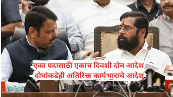 Devendra Fadnavis and Eknath Shinde: गेल्या काही महिन्यांपासून मुख्यमंत्री एकनाथ शिंदे नाराज असल्याची चर्चा महाराष्ट्राच्या राजकीय वर्तुळामध्ये होत आहे. इतकेच नव्हे, तर उपमुख्यमंत्री एकनाथ शिंदे यांच्या मुंबई ते दिल्ली वाढलेल्या गाठीभेटी सुद्धा यामध्ये चर्चा वाढवणाऱ्या ठरत आहेत. या सर्व पार्श्वभूमीवर आता पुन्हा एकदा मुख्यमंत्री देवेंद्र फडणवीस आणि उपमुख्यमंत्री एकनाथ शिंदे यांच्यातील सुप्त संघर्ष समोर आला आहे. एकाच पदासाठी एकाच दिवशी दोन आदेश आणि दोघांकडे अतिरिक्त कार्यभाराचा आदेश देण्यात आल्याने या दोन्ही नेत्यांमध्ये सूप्त संघर्षाची ही नांदी आहे का? असा सुद्धा प्रश्न उपस्थित झाला आहे. मुख्यमंत्री देवेंद्र फडणवीस यांच्याकडे सामान्य प्रशासन विभाग आहे, तर उपमुख्यमंत्री एकनाथ शिंदे यांच्याकडे नगर विभाग खातं आहे. मात्र, या दोन्ही विभागांकडून एकाच पदासाठी दोन आदेश काढण्यात आल्याने राज्य सरकारचा सावळागोंधळ समोर आला आहे. त्यामुळे नेमका हा सावळागोंधळ आहे की दोघांमध्ये सुक्त संघर्षाची ही नांदीच आहे असं सुद्धा बोलले जात आहेत.