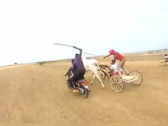 सांगली : जिल्ह्यातील कवठेमहांकाळ तालुक्यात अलकुड येथे विना परवाना बैलगाडी शर्यती भरवण्यात आल्या होत्या. शर्यतीवर बंदी असताना सुद्धा या शर्यती भरवल्या गेल्या होत्या. यावेळी बैलगाडी पळवताना बैलांना अमानुषपणे बॅटरीचा शॉक आणि काठीने मारहाण करण्यात आली होती. हा प्रकार प्राणी मित्र अशोक लकडे यांनी समोर आणला आहे. प्राणी मित्रांनी पोलिसांचे दुर्लक्ष होत असल्याची तक्रार केली आहे. तर याप्रकरणी मनेका गांधी आणि जिल्हा पोलीस अधिक्षक यांना निवेदन देऊन चौकशी करून कारवाई करण्याची मागणी प्राणी मित्र करणार आहेत.