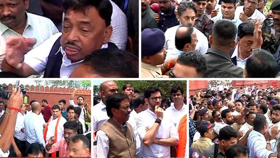 Thackeray Faction Vs BJP Controversy At Rajkot Fort : ज्या छत्रपती शिवाजी महाराजांच्या पदस्पर्शाने पावन झाला सिंधुदुर्ग जिल्ह्यातील राजकोट किल्ल्यावर छत्रपती शिवाजी महाराजांचा पुतळा अवघ्या आठ महिन्यांमध्ये कोसळल्यानंतर महाराष्ट्रामध्ये राजकीय रणकंदन सुरू झालं आहे. या घटनेनंतर अवघ्या शिवप्रेमींमध्ये संतापाची लाट पसरली असतानाच आज राजकोटवर राजकीय महानाट्य पाहायला मिळाले. अभूतपूर्व असा राडा शिवसेना ठाकरे गटामध्ये आणि भाजपमध्ये राजकोटच्या पवित्र भूमीमध्ये झाला. शिवरायांचा पुतळा कोसळल्यानंतर पाहणी करण्यासाठी एकाचवेळी खासदार नारायण राणे आणि काँग्रेस नेते विजय वडेट्टीवार पोहोचल्यानंतर हस्तांदोलन केले. मात्र, आदित्य ठाकरे सुद्धा पोहोचल्यानंतर अभूतपूर्व असा राडा झाला. यावेळी दोन्ही गटाकडून अर्वाच्च भाषेत हिणवण्याचा प्रयत्न झाला. अंगार, भंगार, पेंग्विन ते कोंबड्या आणल्या नाहीत, अशा पद्धतीने दोन्ही गटाकडून घोषणाबाजी करण्यात आली.
