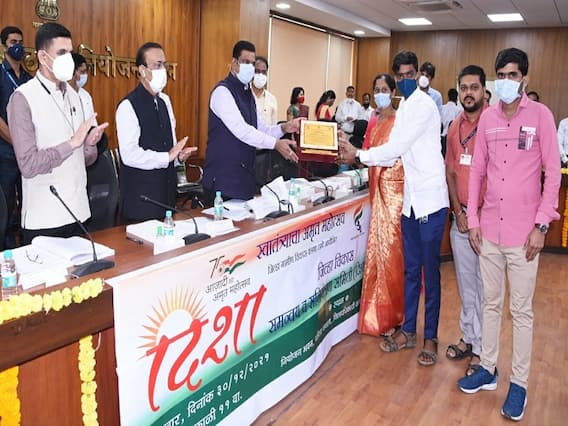 ठाणे : शहरी भागात covid-19 संसर्गाच्या केसेस झपाट्याने वाढत असताना ठाणे जिल्ह्याच्या ग्रामीण भागातून एक सकारात्मक बातमी समोर आली आहे. कोरोना संसर्गाला प्रतिबंध घालण्यासाठी केंद्र शासनाच्या सूचनेनुसार गावातील नागरिकांचे शंभर टक्के लसीकरण केल्याबद्दल देशाच्या अमृत महोत्सव उपक्रमाअंतर्गत मुरबाड तालुक्यातील नारिवली ग्रामपंचायतीचा केंद्रीय पंचायत राज राज्यमंत्री कपिल पाटील यांच्या हस्ते विशेष सन्मान करण्यात आला. देशाच्या अमृत महोत्सव उपक्रमाअंतर्गत जिल्हाधिकारी कार्यालयाच्या नियोजन भवनात झालेल्या जिल्हा विकास समन्वय व संनियंत्रण समितीच्या बैठकीत आज हा सत्कार समारंभ झाला. नारिवली गावाच्या सरपंच देवयानी भोईर, उपसरपंच कल्पेश सोरसे, ग्रामसेवक निलेश गोरले, सदस्य योगेश भोईर यांनी हा सत्कार स्विकारला.