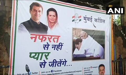 पोस्टरमध्ये पंतप्रधान नरेंद्र मोदी आणि राहुल यांच्या गळाभेटीच्या फोटोसहित 'नफरत से नही प्यार से जितेंगे' असे शब्द लिहिण्यात आले आहे. दादर, जोगेश्वरी, सीएसटी, विक्रोळी भागात काँग्रेसने पोस्टर्स लावले आहेत. राहुल गांधी यांनी पंतप्रधान नरेंद्र मोदी यांची गळाभेट घेतल्याचं या पोस्टरमध्ये दिसत आहे.