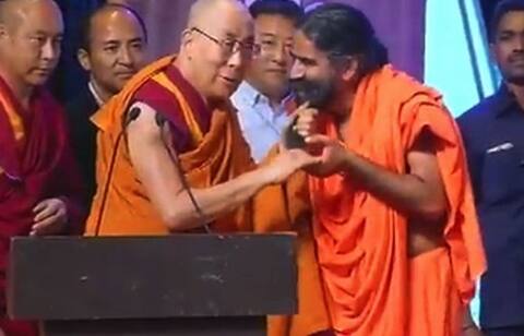 मुंबईत पार पडलेल्या याच कार्यक्रमात धर्मगुरू दलाई लामा यांनी चक्क योगगुरू रामदेव बाबा यांची दाढी खेचली.