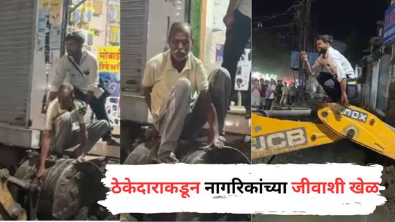 नालासोपारा (Nalasopara) पूर्वेच्या अल्कापूरी येथील साईधाम अपार्टमेंटमधील एक मोबाईलचं दुकान सुरु होतं. पालिकेचं गटाराचं काम सुरु असल्याने ठेकेदाराने दुकानासमोर चक्क दहा फुट खोदून ठेवलं, यामुळे दोन इसम या दुकानातच अडकले. त्यांना राञी पावणे अकराच्या सुमारास बाहेर काढण्यासाठी चक्क जेसीबीचा वापर करण्यात आला. दुकानातील दोन इसम जीवावर उदार होऊन जेसीबीच्या साहाय्याने घाबरत घाबरत बाहेर आले. यावेळी रात्रीच्या सुमारास बघणाऱ्या नागरिकांनी एकच कल्लोळ केला होता.