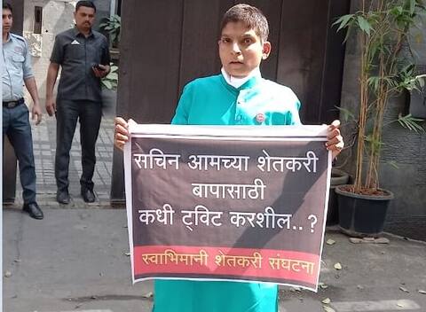 स्वाभिमानी शेतकरी संघटनेचे युवा प्रवक्ते रणजीत बागल यांनी सचिन तेंडुलकरच्या मुंबईतील वांद्रे इथल्या निवासस्थानाबाहेर आंदोलन केलं. त्यांच्या हातातील फलकावर सचिन, आमच्या शेतकरी बापासाठी कधी ट्वीट करशील असा सवाल त्यांनी विचारला आहे.