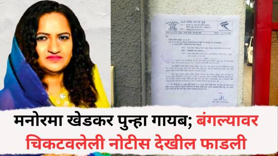 Manorama Khedkar: नवी मुंबईतून क्लीनरचे अपहरण केल्याबद्दल पूजा खेडकरचे आईवडील दिलिप खेडकर आणि मनोरमा खेडकर (Manorama Khedkar) या़ंच्यावर नवी मुंबईच्या रबाळे पोलीस ठाण्यात गुन्हा दाखल आहे. मात्र ३० ऑगस्टला मनोरमा खेडकर यांना १३ ऑक्टोबरपर्यंत न्यायालयाकडून अंतरिम जामीन मिळाला होता. मात्र हा जामीन देताना मनोरमा खेडकर यांनी पोलीसांना तपासात सहकार्य करण्याची अट घातली होती. मात्र मनोरमा खेडकर (Manorama Khedkar) या त्यानंतर गायब झाल्या असून पोलीसांचा त्यांच्याशी संपर्क होत नाहीये. शिवाय त्यांच्या वकिलांना देखील मनोरमा यांच्याशी संपर्क होत नाहीये. त्यामुळे रबाळे पोलीसांनी खेडकर यांच्या पुण्यातील बंगल्यावर चौकशीला हजर राहण्याची नोटीस चिकटवली होती. मात्र काही वेळापुर्वी ही नोटीस देखील फाडण्यात आली आहे.(Manorama Khedkar)