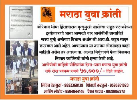 कोरेगाव भीमा हिंसाचारात मृत्युमुखी पडलेल्या राहुल फटांगडेच्या मारेकऱ्यांची माहिती पोलिसांना देणाऱ्यांना मराठा युवा क्रांतीकडून 50 हजार रुपयांचं इनाम जाहीर करण्यात आलं आहे.