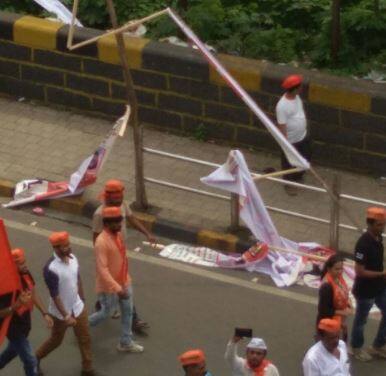 भायखळ्यातील जिजामाता उद्यानाजवळ शिवसेनेने उभारलेलं मराठा क्रांती मोर्चाचं पोस्टर फाडण्यात आलं.